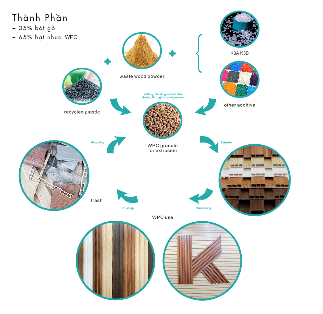 Được kết hợp từ bột gỗ và hạt nhựa WPC theo tỉ lệ : 35% bột gỗ và 65% hạt nhựa WPC nguyên sinh, kết hợp với chất trợ liên kết và một số chất phụ gia nhằm tăng cường đặc tính của sản phẩm. Vì vậy, 3K WPC được gọi là vật liệu sợi tự nhiên được gia cường bằng composite nhựa.. Bột nhựa và gỗ được trộn đều, đồng nhất rồi đi qua dây chuyền hợp nhất tạo ra hạt compound(*), từ các hạt compound là nguyên liệu duy nhất cho dây chuyền máy đùn, ép thành các hình dạng theo yêu cầu.