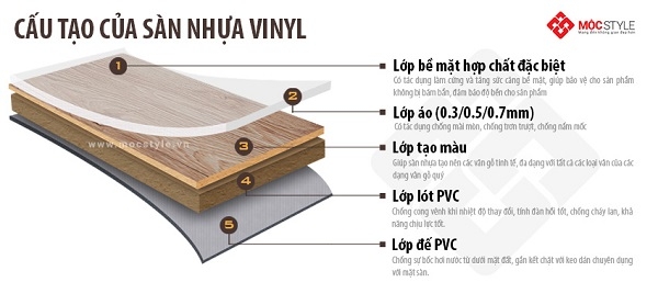 Sàn nhựa giả gỗ có kết cấu nhiều lớp với các chức năng riêng biệt tạo nên độ bền tối ưu cho sàn. Lớp ngoài cùng trên bề mặt là lớp phủ bảo vệ chống UV, các tác động ngoại lực, tránh phai màu, trầy xước cho sàn. Lớp áo phủ nano chống mài mòn, nấm mốc, ngăn chặn tình trạng trơn trượt gây nguy hiểm khi sử dụng. Các lớp lót và đế giúp sàn liên kết chắc chắn cố định với sàn, chống cong vênh bởi các tác động ngoại cảnh, nhiệt độ.