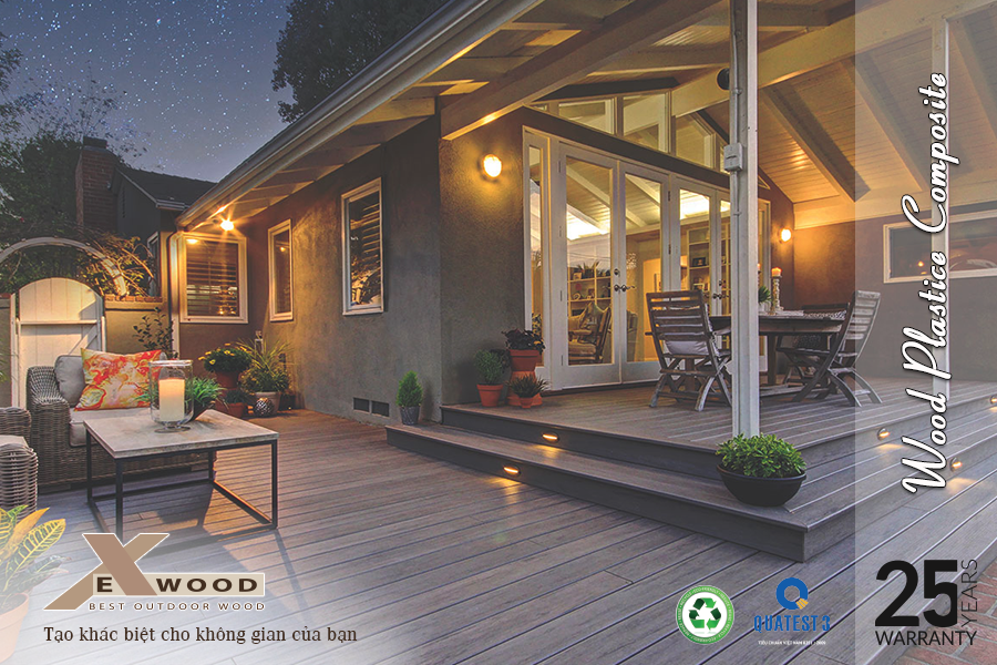 EXWOOD WPC ra đời để thay thế gỗ tự nhiên, sử dụng hạt nhựa PE/PP và bột gỗ được sản xuất theo cách ép đùn và phun đúc, không chứa keo trong các sản phẩm. Do đó không chứa các chất độc hại. EXWOOD được sử dụng để trang trí cho ngoại thất ngôi nhà của bạn với rất nhiều công dụng như làm sàn hồ bơi, che nắng, hàng rào, pergola….