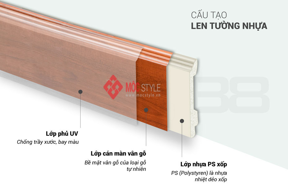 Len tường nhựa là chỉ chân tường (phào) thành phần cấu tạo chính là nhựa PS xốp, Lớp phủ bề mặt UV giúp bảo vệ màu sắc sản phẩm, chống trầy xước, với lớp giữa cán màng film vân gỗ đẹp tự nhiên, lớp cuối cùng với thành phần chính là nhựa PS (Polystyren) xốp là loại nhựa nhiệt dẻo, không mùi, được sử dụng thông dụng. Len nhựa sản xuất từ hạt nhựa PS tổng hợp theo cách ép đùn và phun đúc, không chứa keo trong các sản phẩm, do đó không chứa các chất độc hại, sản phẩm là vật liệu xanh và được tái sử dụng 100%.
