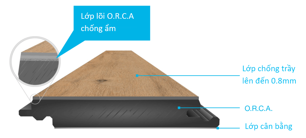 Công nghệ O.R.C.A. là tốt nhất hiện nay, được kết hợp các phẩm chất tốt nhất dựa trên đặc tính sinh học của ván sàn và sàn gỗ chống thấm thông thường. Trong O.R.C.A., vật liệu hữu cơ được chế tạo chống lại chất lỏng bằng công nghệ đặc biệt