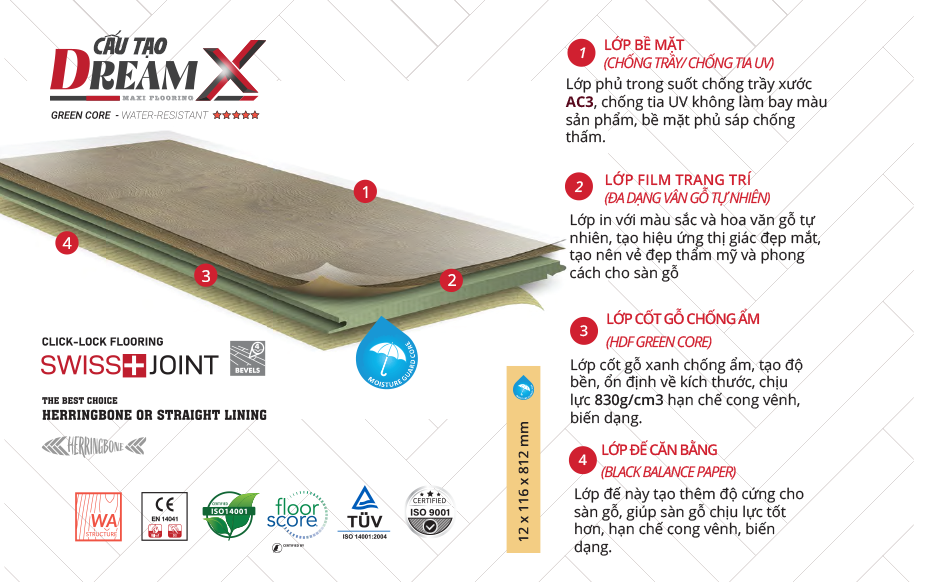 • Cốt HDF: Cốt xanh, siêu chịu nước
