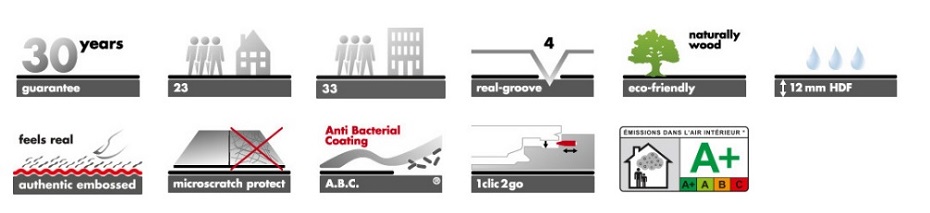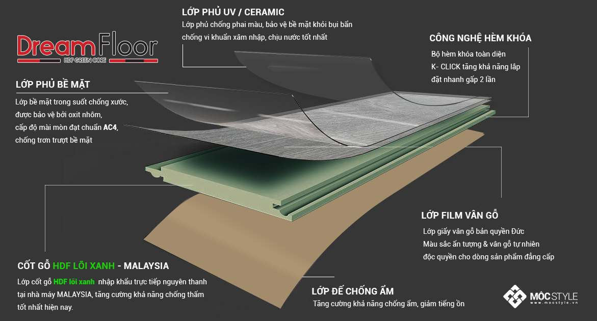 Đặc biệt lớp áo hay còn gọi là lớp vân gỗ không còn những tone màu truyền thống Châu Á nữa mà thay vào đó là những vân màu được thiết kế 100% từ châu âu, độ chống trầy xước cấp độ AC4 có thể sử dụng nơi có nhiều người qua lại như : Trung tâm thượng mại, Phòng tập Gym...