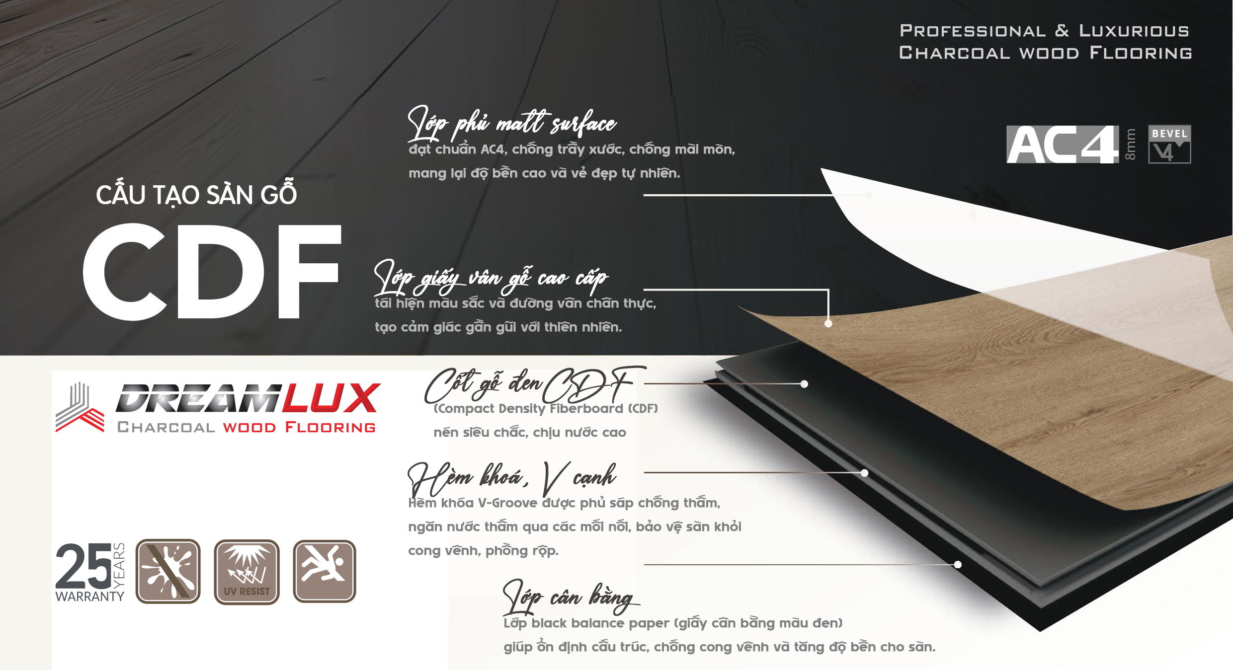 | Cốt gỗ | CDF Core | Cốt gỗ: HDF đen – cốt gỗ chịu lực cao, chống nước tốt, mật độ cao |