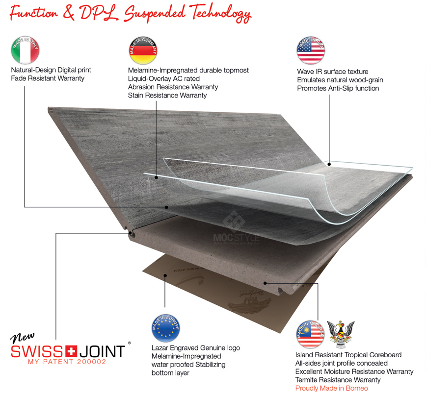 Sàn gỗ Rainforest mang đến công nghệ lắp đặt SWISS+JOINT tốt nhất và nhanh chóng nhất, chống mài mòn cao xung quanh cạnh hèm kết nối.