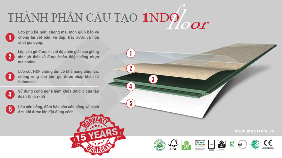 + Lõi HDF làm từ cây gỗ cứng vùng nhiệt đới : Lõi HDF được sản xuất bằng cách lựa chọn sử dụng các loài cây gỗ cứng vùng nhiệt đới tại INDONESIA, được đánh giá là một trong những loại gỗ tốt nhất trên thị trường toàn cầu về tính ổn định và chống ẩm cao.