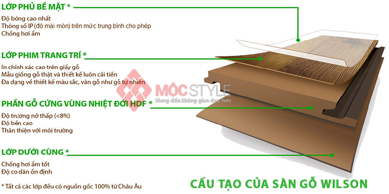 Sàn gỗ Wilson: được sản xuất tại Việt Nam theo công nghệ tiên tiến của Châu Âu với các màu sắc đa dạng, đẹp như gỗ tự nhiên và phù hợp với thị hiếu của người Việt Nam.