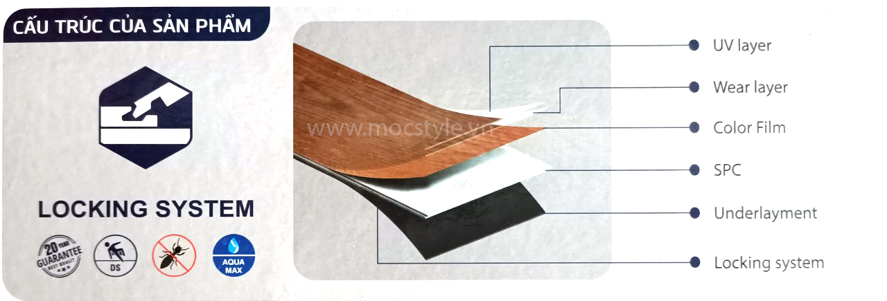 Sản phẩm có đặc tính ưu việt, chịu nước và độ ẩm 100%, do được cấu thành từ Poly Vinyl Clorua (PVC) nguyên sinh và bộ đá Nano siêu mịn, đồng thời sử dụng công nghệ khóa hèm UNICLIC vượt trội (đối với dòng sàn nhựa hèm khóa), giúp việc lắp đặt được dễ dàng, thuận tiện. Lớp phủ bề mặt của ván sàn được sử dụng công nghệ “nhám bề mặt” tiên tiến nhất hiện nay (EIR), tạo nên độ cứng “Class 33”. Ngoài ra, ván sàn còn có tính năng chống cháy, chống mài mòn, trầy xước, chống trơn trượt (AC5). Đặc biệt hơn, lớp màng Vinyl trắng trong cùng với lớp phủ chống tia UV trên bề mặt giúp ván sàn không bay màu.
