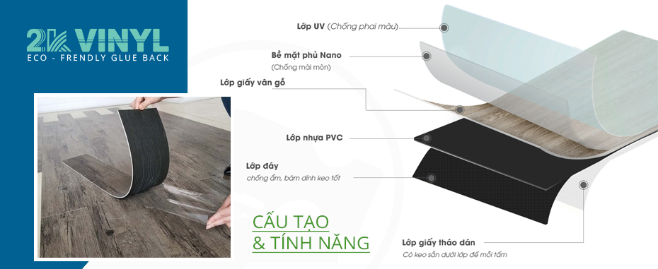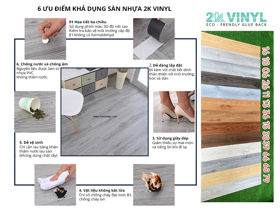 Sàn nhựa 2K VINYL có keo sẵn (hay còn gọi là sàn nhựa tự dính hoặc tháo dán) có nhiều lợi ích đáng chú ý. Sàn nhựa 2K VINYL có keo dán sẵn ở mặt dưới, chất liệu PVC, tiện dụng để dán mặt trang trí sàn. Sản phẩm này là giải pháp tốt nhất việc thi công, lắp đặt dễ dàng hơn.