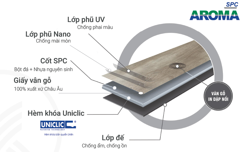 Sàn nhựa AROMA Spc được cấu tạo với 5 lớp cơ bản và cạnh hèm khóa Uniclic(1) sau: Lớp đầu tiên là lớp phủ UV như rào cản ngăn sự tiếp xúc trực tiếp từ môi trường sống như ánh sáng và chống lại sự bay màu sản phẩm, lớp phủ Nano chống mài mòn, cùng lớp giấy vân gỗ được xuất xứ 100% từ Châu Âu được lấy ý tưởng từ kiểu vân của cây gỗ tự nhiên, lớp thứ 4 là lớp SPC(2) giữ sự ổn định bề mặt sàn, chất liệu không sợ nước, được trộn với một công thức tốt nhất mang lại độ bền cao và quyết định giá trị vật liệu, lớp cuối cùng là lớp đế có công dụng chống ẩm, chống ồn, sự bốc hơi từ mặt sàn lên.