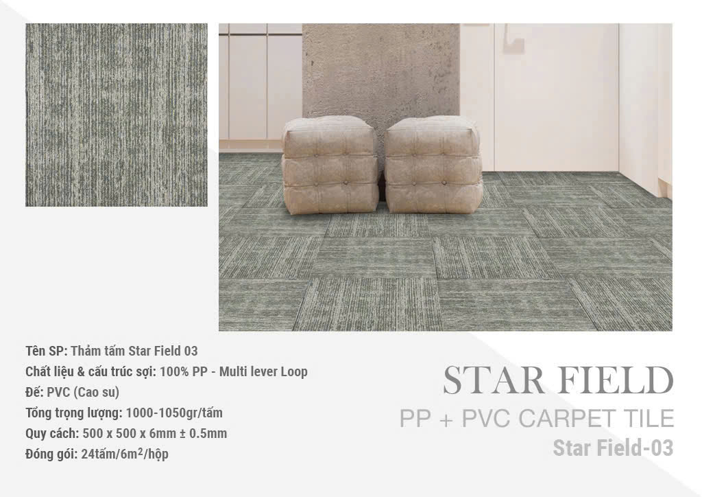 Thảm tấm Star Field được làm từ 100% sợi tổng hợp Polypropylene (PP), nổi bật với khả năng chống mài mòn vượt trội giúp thảm luôn giữ được hình dạng nguyên vẹn, trông như mới và ít bị hư hại qua thời gian.
