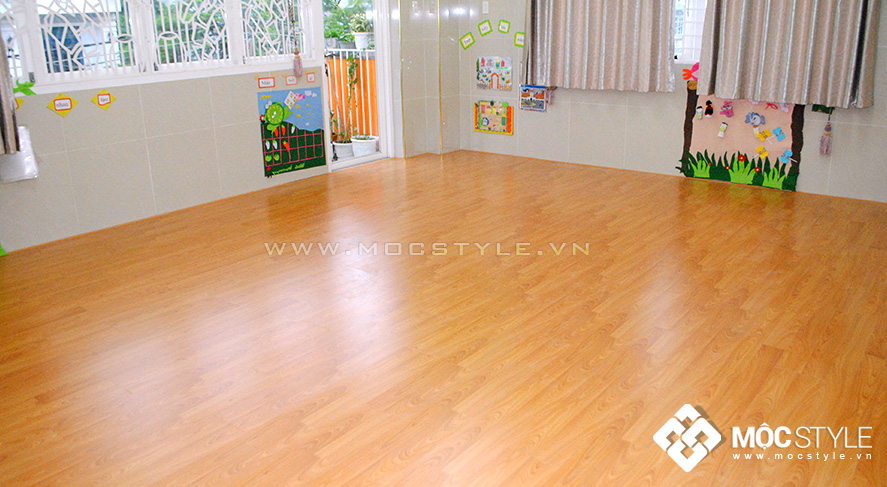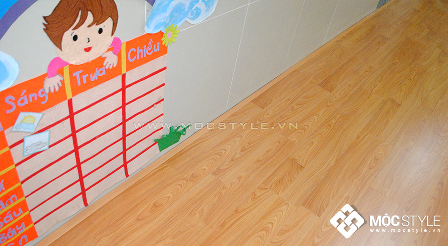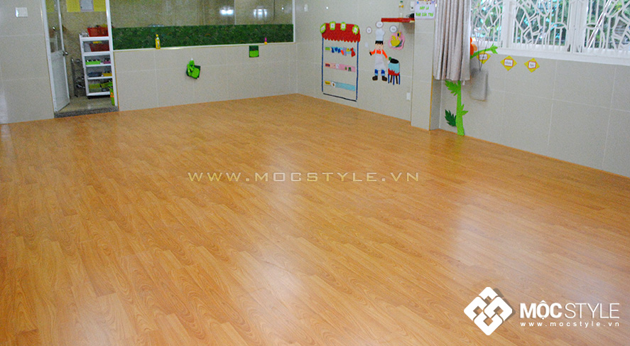 Sàn gỗ Leowood được sản xuất tại Thái Lan với độ bền cao, khả năng chịu nước và chống trần xước tốt, đã được chủ đầu tư chọn để sử dụng làm sàn trường mần non.